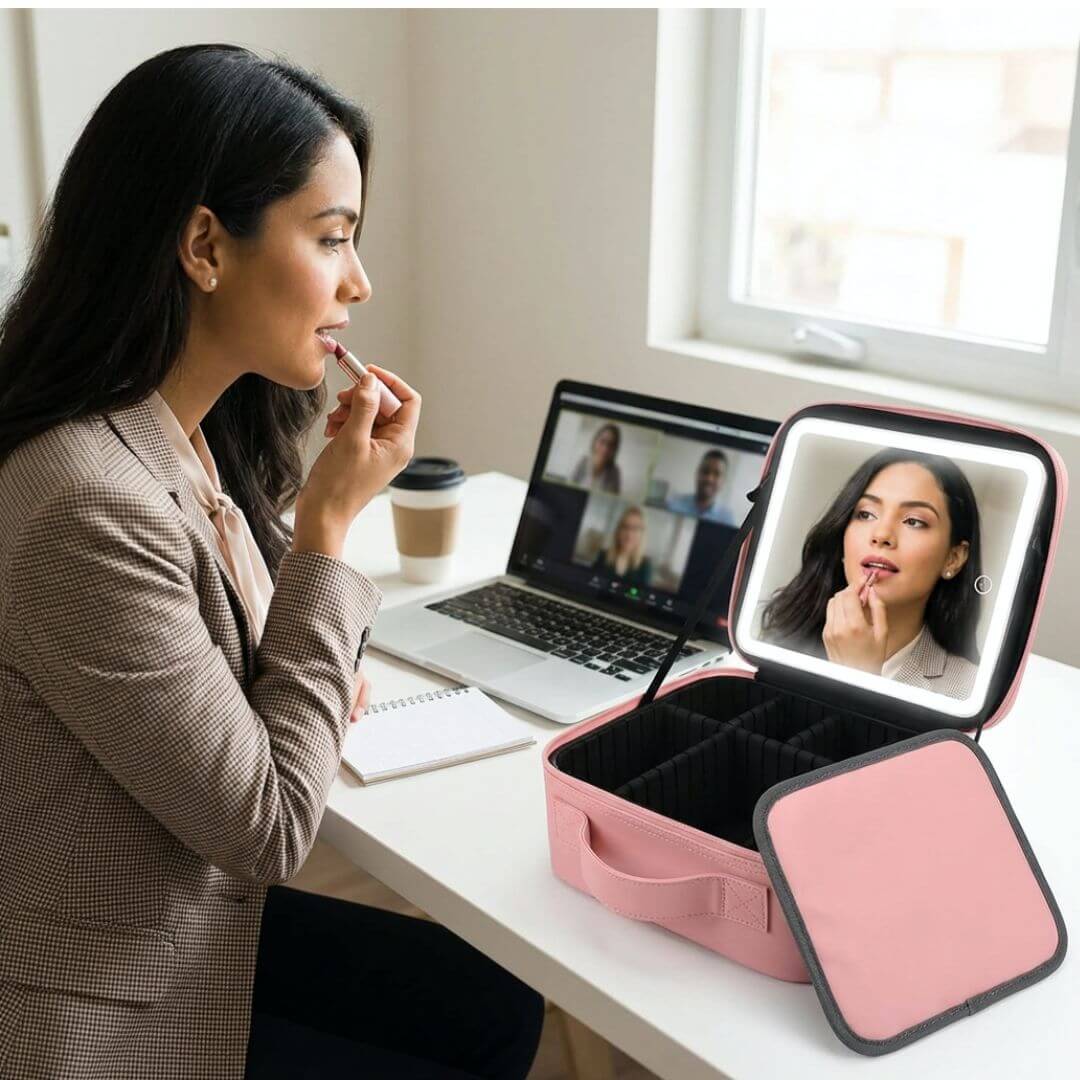 Abres tu StudioCase en el escritorio. Enciendes la luz fría (perfecta para videollamadas). Te maquillas viendo cada detalle con claridad total.